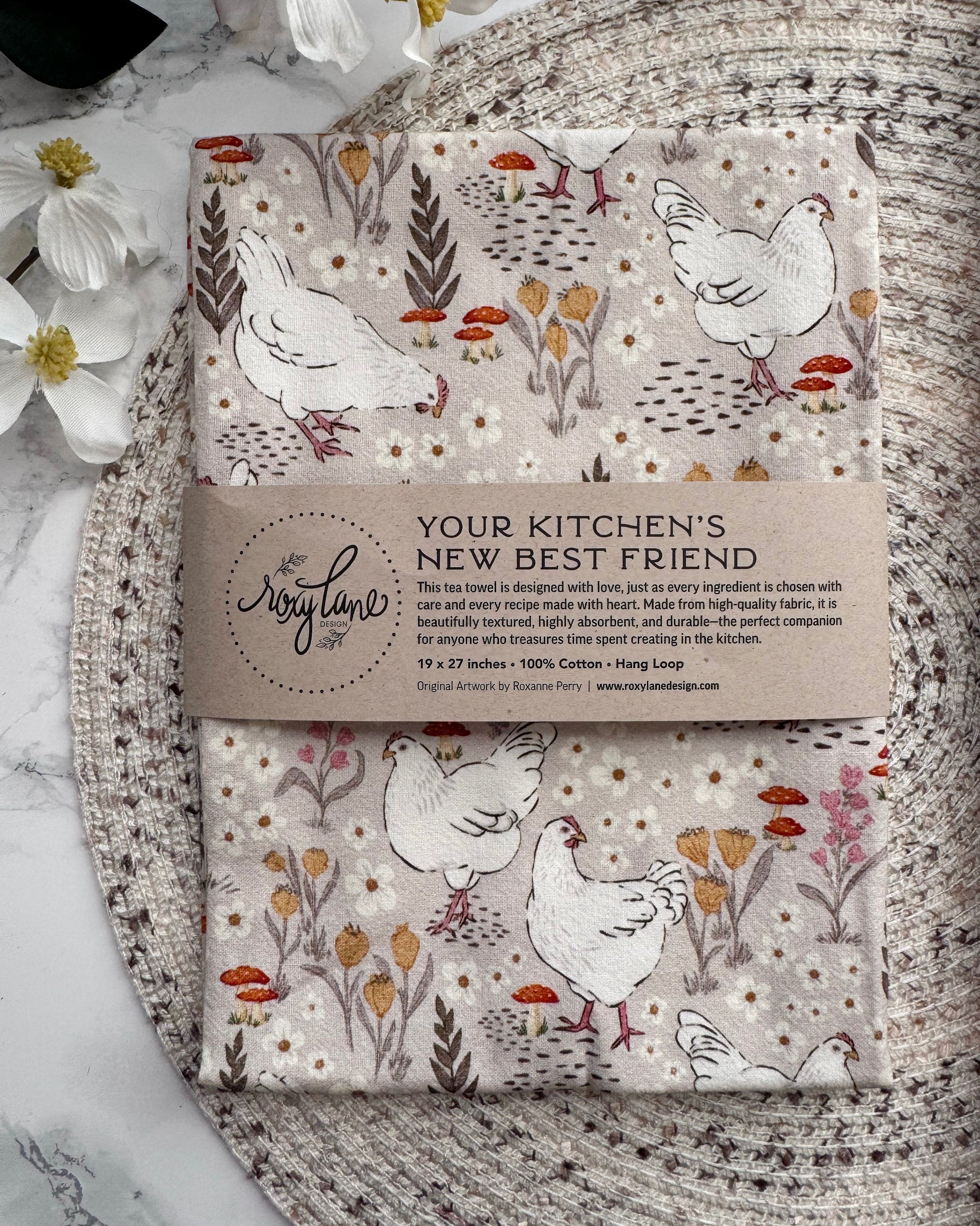 Delightful white hens roam among blooming wildflowers in soft earth tones, bringing rustic farmhouse charm to your kitchen décor.