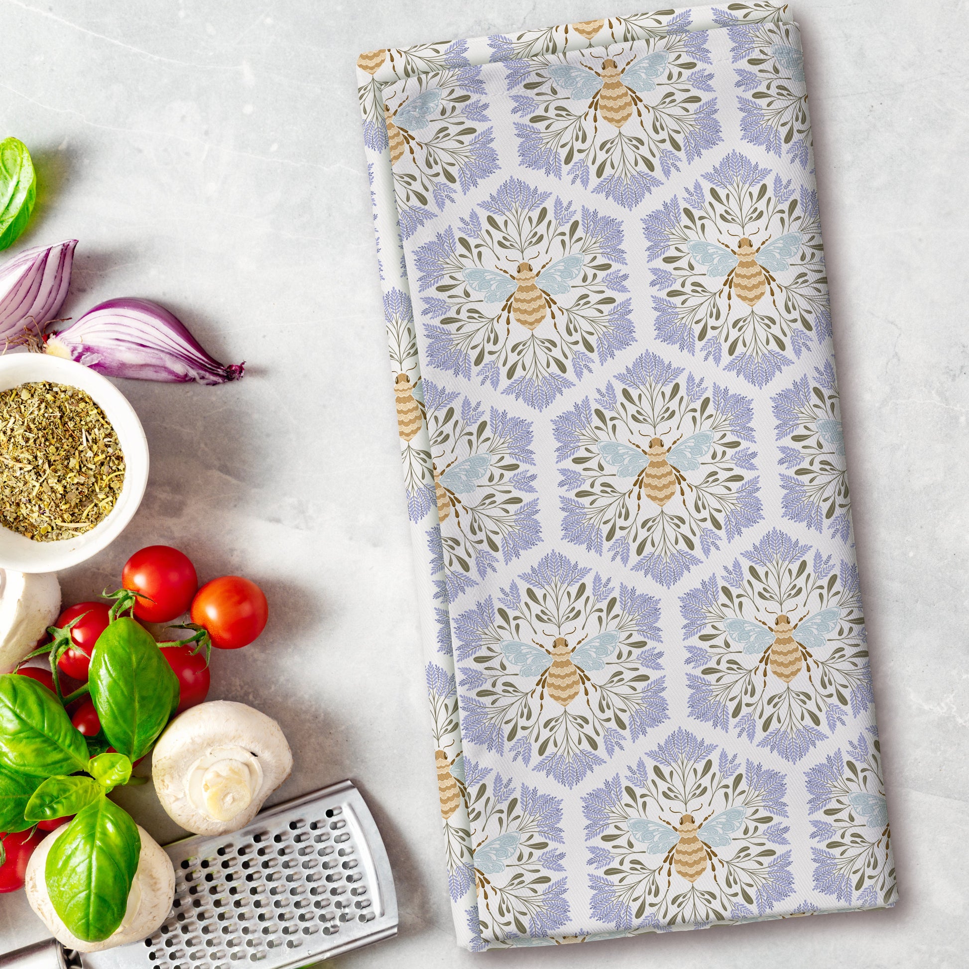Golden bees buzz amid leafy hexagonal wreaths in calming lavender hues—an elegant, nature-inspired pattern that celebrates pollinators.